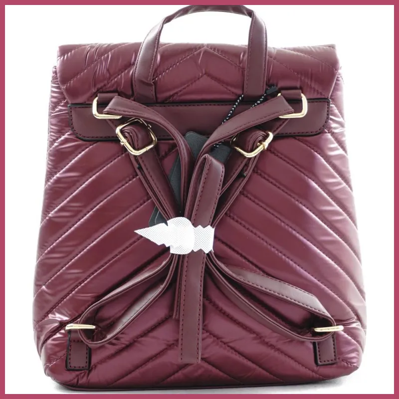 Női hátitáska csillaggal és V varrott mintával, vízhatlan, vörös színben. Fazonja merev, anyaga puha tapintású. Tetején áthajtós, patenttal, alatta pedig cipzárral is záródik. Belül egyterű, egy cipzáras és két benyúlós zseb. Méretei: 32×32×9 cm.
